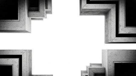 Abstract concrete architectural elements with sharp angles and shadows forming a frame on a white background.