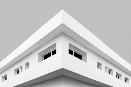 Close up of minimalistic architectural building structure or skyscraper in monochrome filter. Modern white house making from concrete architecture. Artistic creative minimal house concept. AIG42.