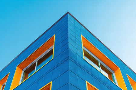 A striking capture of a modern architectural corner showcasing sleek lines and geometric precision set against a clear blue sky, embodying contemporary design aesthetics.