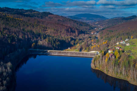 Aerial view of Zapora Wisla Czarne, water dam in Poland close to city of Wisla, with big accumulation lake behind the dam in late autumn.