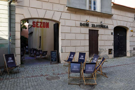 Lublin, Poland - September 11, 2021: A cobblestone street in the old town, with empty outdoor restaurant loungers waiting for the arrival of customers.