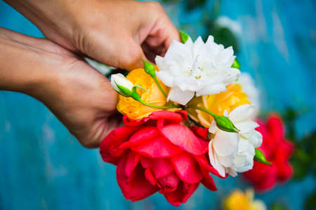 Two red and one yellow roses on a blue background.Holiday gift. Beautiful flower.A gift for March 8 and mother's day.Holiday background.