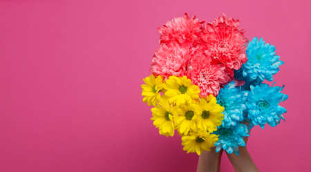 Blue flowers and woman holding hand isolated on pink background. woman and mother day. Summer concept mock up and copy space. top view. flower nature and spring season. Banner