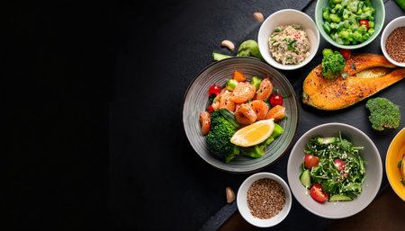 Healthy food clean eating selection on black background. Balanced diet.