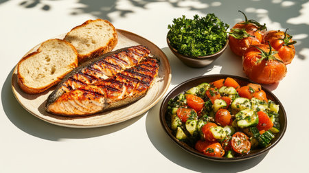 Grilled salmon fillet accompanied by fresh vegetables, herbs, and bread on a bright surface highlighting a healthy eating lifestyle