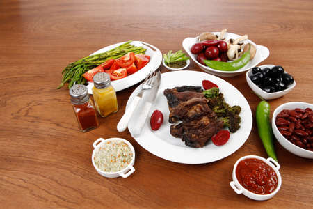 lunch of grilled meat served on big white plate with asparagus pickles tomatoes olives hot black red green pepper salt baked beans and ketchup on wooden table