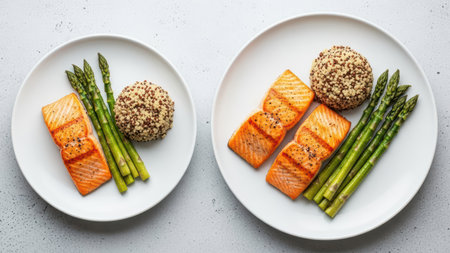 Balanced meal with salmon, asparagus, and quinoa on white plates.