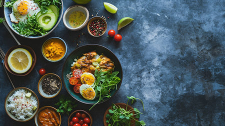 A table laden with an assortment of diverse foods, showing a vibrant array of colors, textures, and flavors.