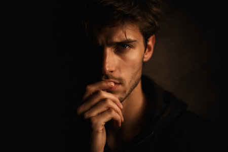 A young man poses thoughtfully with his hand on his chin in a dimly lit environment, highlighting his facial features and expression.