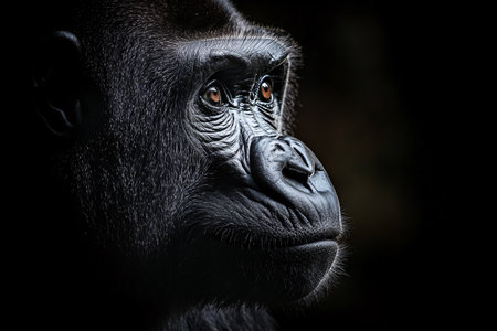 Close-up of a gorilla's contemplative expression amidst a dark ambiance