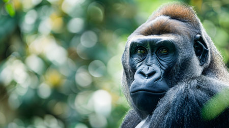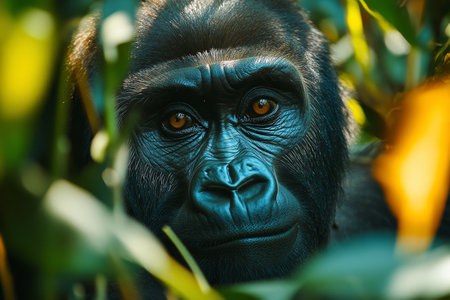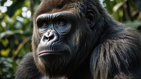 Close-up portrait of a powerful gorilla in its lush rainforest habitat.