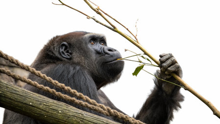 Adult gorilla, seemingly in deep thought, isolated on a white background