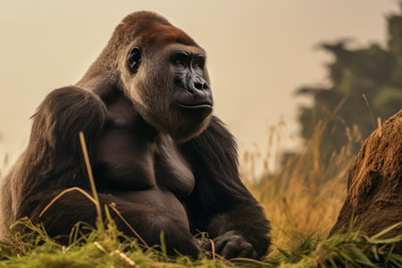 An AI generated illustration of a majestic gorilla standing in a tranquil grassy field