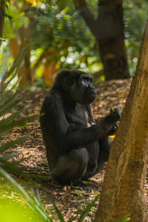 Gorilla gazing upwards in lush green forest, wildlife and nature photography concept