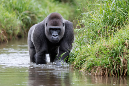 Silverback gorilla moving through water with determination, representing strength and wildlife