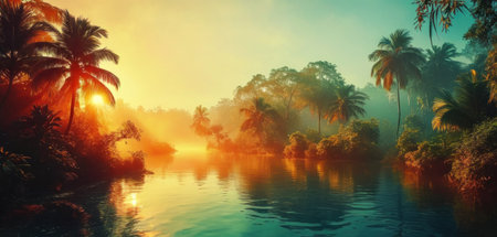 A captivating tropical landscape showcasing a serene view of lush greenery and tranquil palm trees reflecting on calm water under a bright sky.