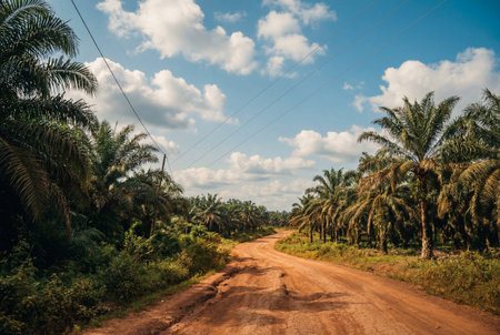 A rough unpaved road made of red earth stretches into the distance between rows of tall oil palm trees under a sunny sky with white clouds and overhead power lines.