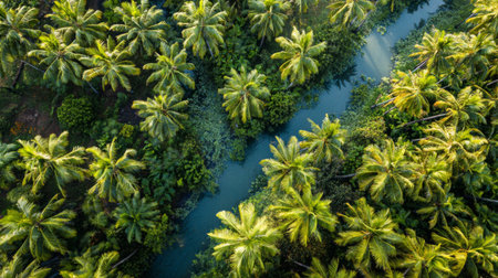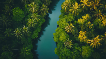 A breathtaking aerial view of lush green palm trees surrounding a serene river creates a peaceful natural landscape with vibrant colors and tranquility.
