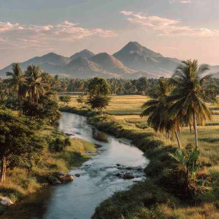 A breathtaking aerial view of a lush tropical landscape showcases palm trees lining a calm river, bordered by vibrant agricultural fields, evoking serenity and natural beauty.