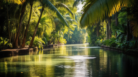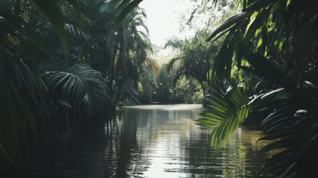 Vibrant green foliage and palm leaves create a natural frame around a tranquil river flowing through a lush tropical jungle, showcasing the beauty and serenity of nature