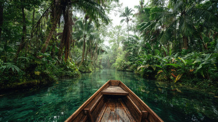 A wooden boat glides peacefully along a clear river, surrounded by dense tropical foliage. The composition showcases an overhead perspective, emphasizing the vibrant green colors and textures of the lush environment. The image can be used for various commercial projects related to travel or nature.