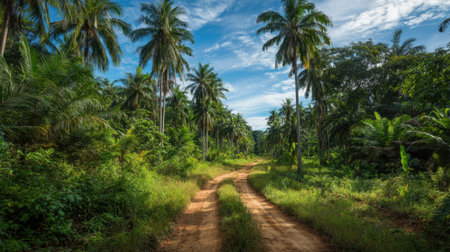 A sandy path winds through vibrant palm trees and dense foliage under a bright blue sky.