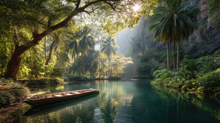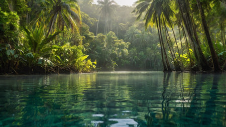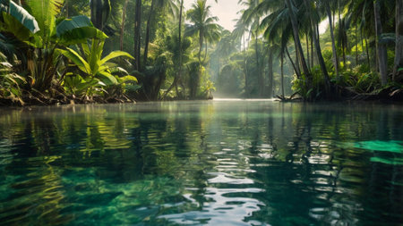 Discover the tranquility of a pristine jungle waterway, where lush green foliage envelops serene waters under soft morning light, perfect for nature lovers.