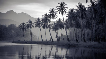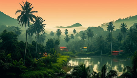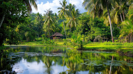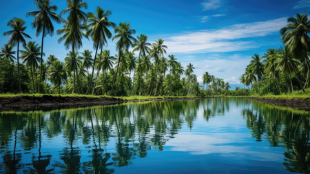 Tropical Paradise: Tranquil Waterside Oasis with Lush Green Coconut Trees
