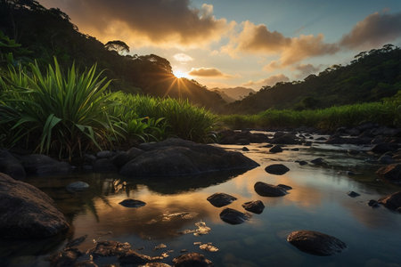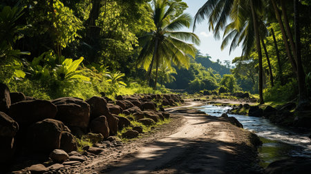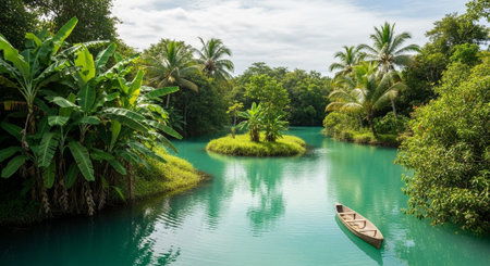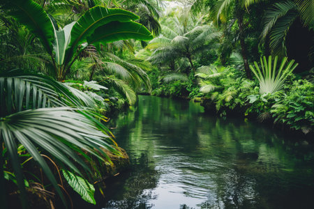 Serene river flowing through a vibrant green tropical jungle with lush vegetation