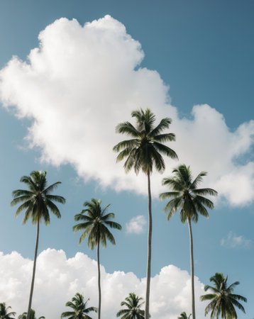 AI Generated. Green Palm Trees On The Background Blue Sky With White Fluffy Clouds Tropical Island Nature