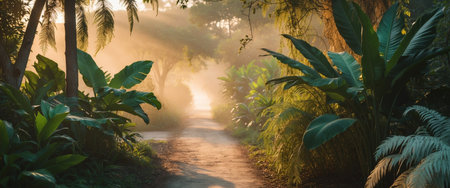 AI Generated. Evening light illuminating a tranquil footpath surrounded by lush tropical plants and vibrant foliage in a serene natural setting
