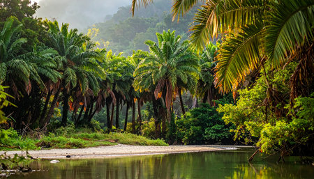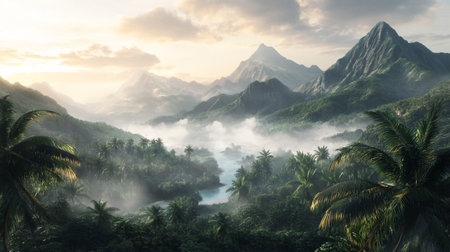 A dense tropical rainforest filled with vibrant greenery unfolds against a backdrop of mist-covered mountains. Morning light filters through the lush foliage creating a serene ambiance.