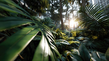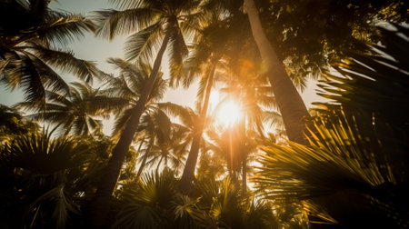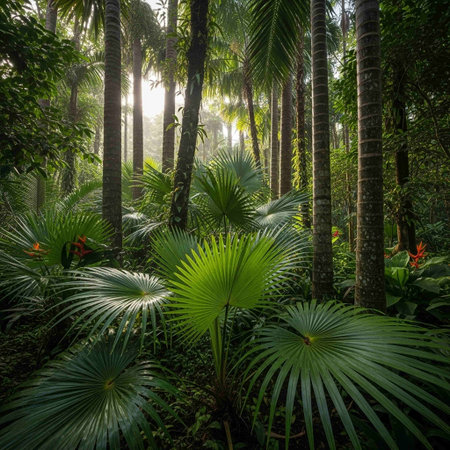 Experience the beauty of a lush tropical jungle where sunlight filters through vibrant palm leaves, creating a serene and tranquil atmosphere in nature.