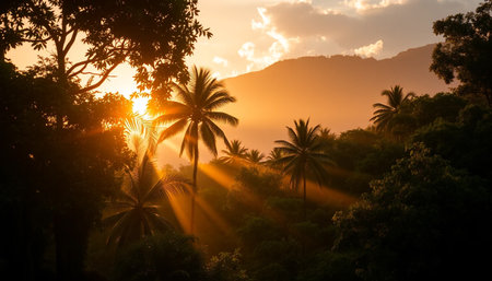 Sunlight filters through dense greenery in a tropical forest, creating a peaceful atmosphere full of life and vitality.