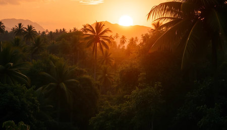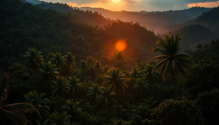 Discover the breathtaking beauty of a tropical forest featuring dense greenery and palm trees nestled within a serene mountain valley, creating a peaceful escape.