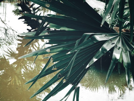 Tropical Foliage background with copy space, with water dew drops on the leaves.
