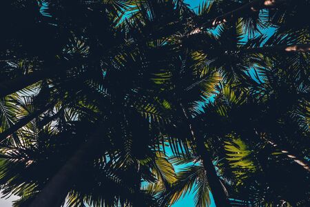 Tropical trees background. Coco palms peaceful blue sky. Exotic summer nature background, green leaves, natural landscape. Summer tropical island, holiday or vacation pattern