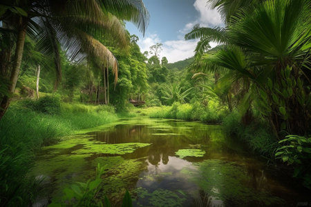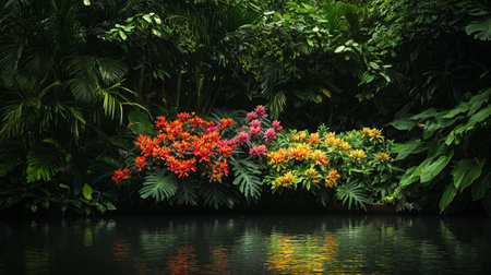 dark green jungle foliage reflecting in the river water, created with generative ai