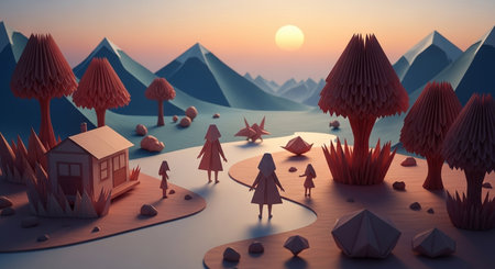 Origami landscape with trees and deer, created using generative ai technology. Orgiami art, scenery, nature and pattern concept digitally generated image.