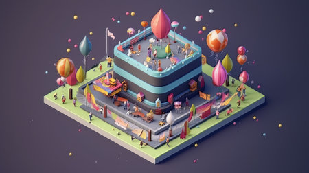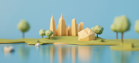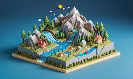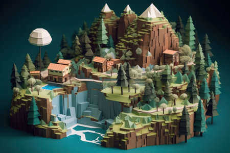An isometric illustration depicts a stylized landscape featuring a river, mountains, and trees. The scene employs a low-poly geometric style with vibrant colors, showcasing a dynamic composition. The image could be suitable for various creative projects, including digital art, educational materials, and graphic design purposes.