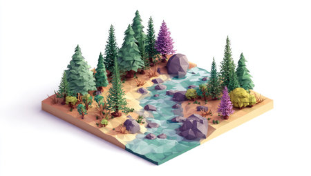This isometric illustration showcases a river flowing through a forest, rendered with low-poly art style. The composition features various trees, rocks, and a sandy bank, bathed in soft lighting. Suitable for conceptual projects, the graphic may be utilized for editorial content or advertising purposes.