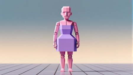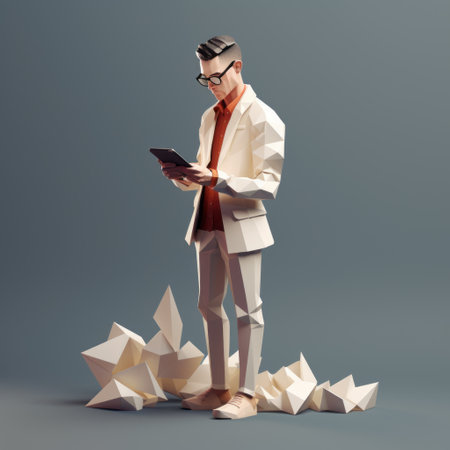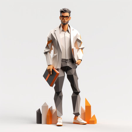 a high detailed 3d low-poly design showcases a citizen writer character in a minimalistic style. the design features clean and efficient geometry with sharp contrast and bold colors. with a 45-degree angle, the character is presented in high-resolution with fine details and realistic surface materials. the image is isolated with a white pastel background, enhancing the intricate detail and depth. ai generated