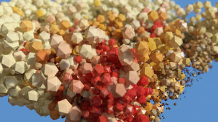 3D illustration of a abstract swarm of geometric colorful elements on a blue background