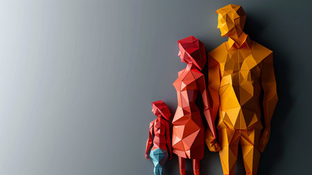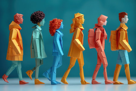 A line of origami people of various colors walk on a blue background. The people are wearing different clothes and have different hairstyles.