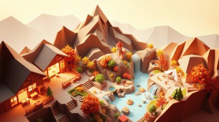 This image presents a stylized, isometric view of a mountain resort. The scene is rendered in a low-poly aesthetic, with angular, geometric shapes defining the mountains, buildings, and landscape elements. A central waterfall cascades into a serene blue pool. The resort features cabins, patios, and a miniature town with red-roofed buildings. Trees in autumn colors dot the scene. The warm, golden light suggests either sunrise or sunset, creating a cozy and inviting atmosphere. The overall effect is charming and whimsical, evoking a sense of peace and relaxation.