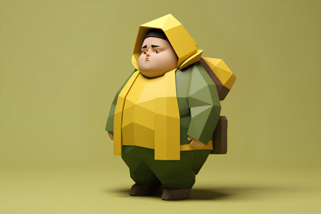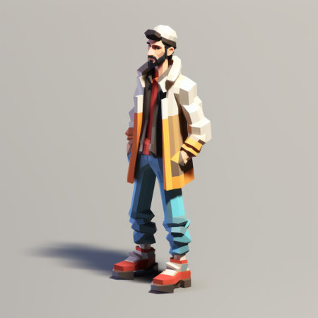 low poly man in a yellow fur coat and hat, rendered in cinema4d with industrial design style. realistic depiction of everyday life with charming characters. saturated color and wet-on-wet blending add a normcore touch to the image. ai generated
