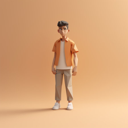 a 3d rendered figure of a man wearing a yellow shirt, reminiscent of anime-inspired character designs. the image features muted and subtle tones, with influences from max fleischer's art style. the figure is portrayed in a naive and childlike manner, with highly realistic details. the color palette includes white and orange elements. ai generated
