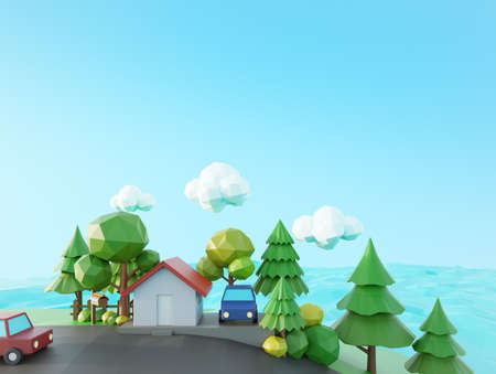 Low poly landscape with mountains, trees and rocks. 3d rendering