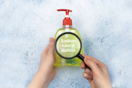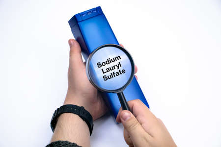 Chemical components on the shampoo label: Sodium Lauryl Sulfate (sls, sles). A hand holds a blue jar and a magnifier, where the harmful ingredients of a detergent are written in close up.