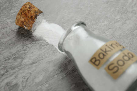 Overturned glass bottle with baking soda on gray table, closeup